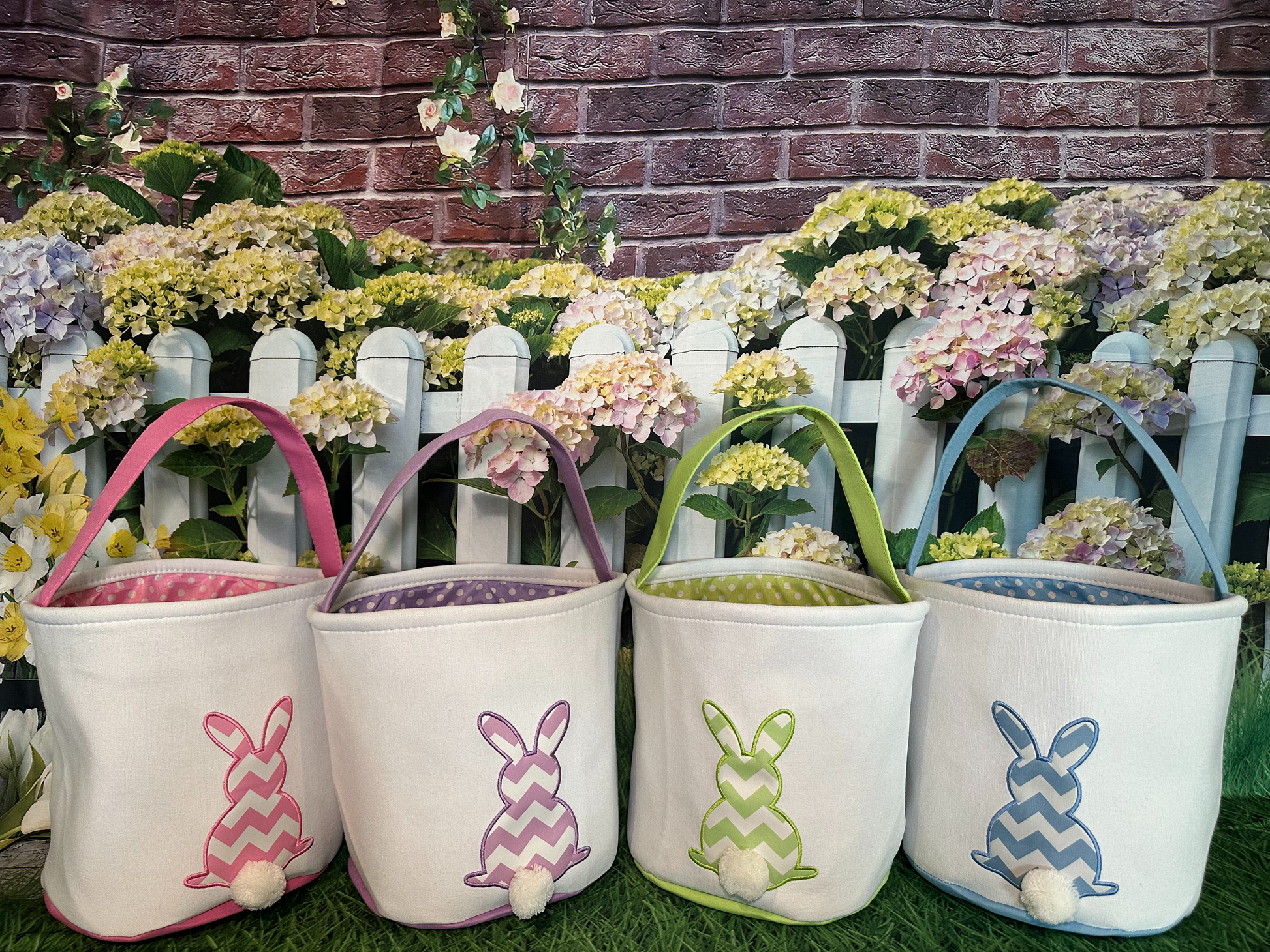 These baskets are unstructured canvas material with a chevron pattern bunny and custom embroidered name. Basket dimensions are approximately: L=10.5in. x H=8.5in. x W=10.5in. (Not including the handle) The handle and bottom are the same color as the bunny. The inside has a polka dot pattern. Great size easter basket for any age.
