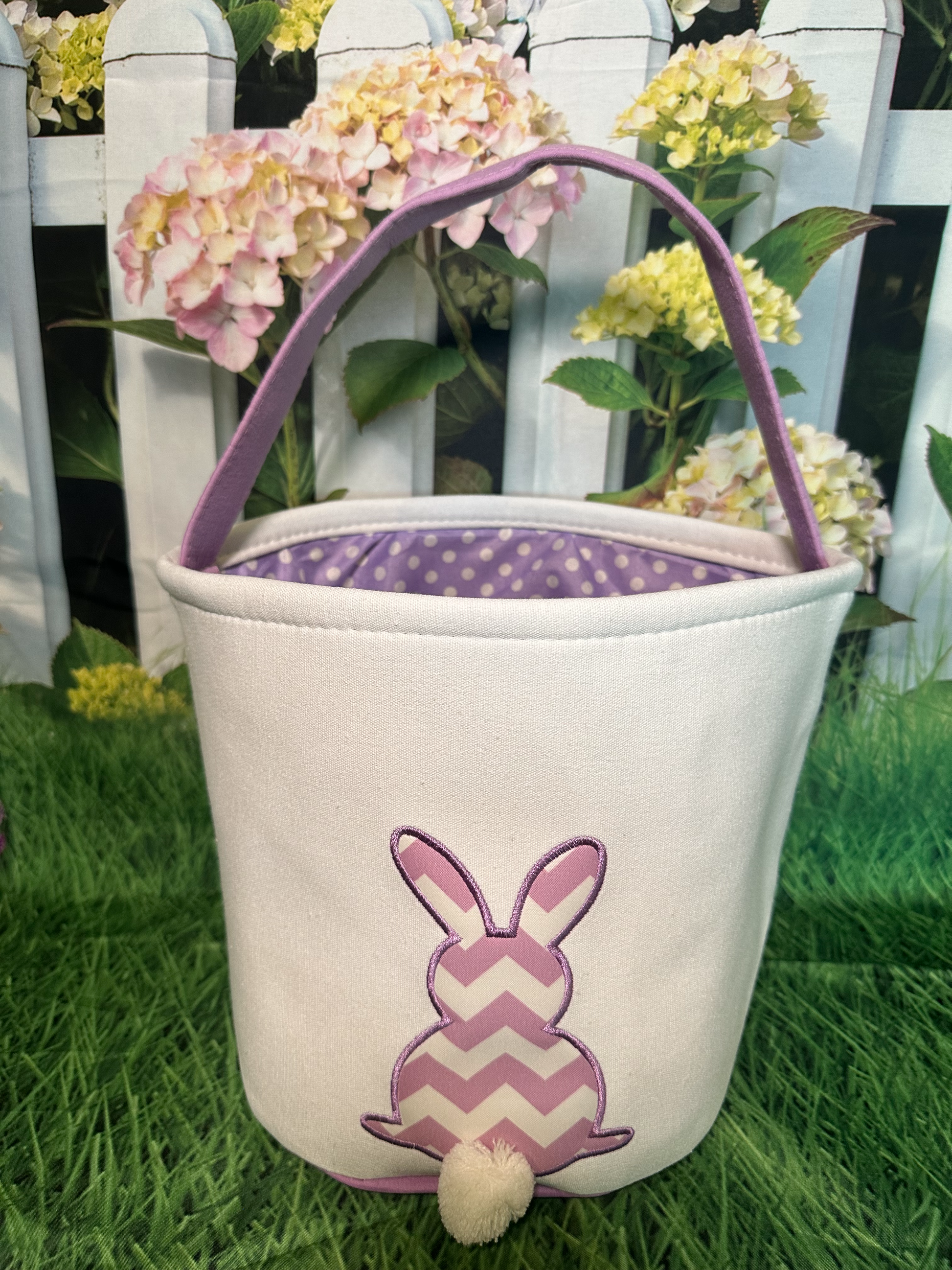 These baskets are unstructured canvas material with a chevron pattern bunny and custom embroidered name. Basket dimensions are approximately: L=10.5in. x H=8.5in. x W=10.5in. (Not including the handle) The handle and bottom are the same color as the bunny. The inside has a polka dot pattern. Great size easter basket for any age.